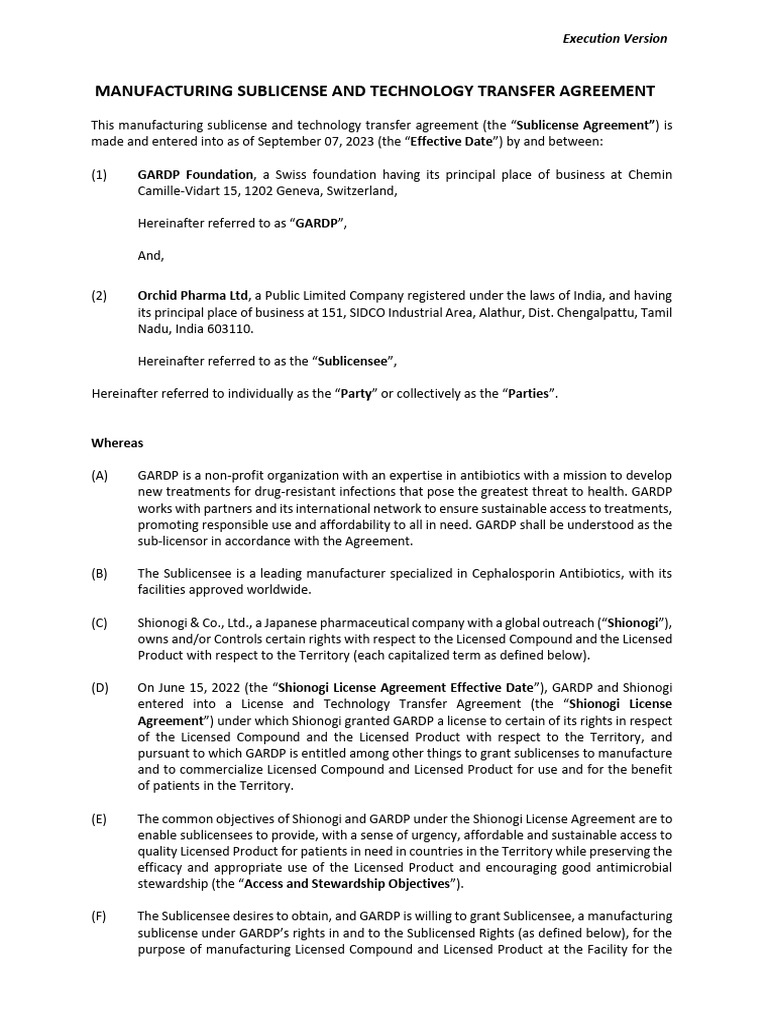 GARDP Orchid Manufacturing Sublicense Agreement Final Redacted