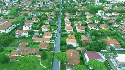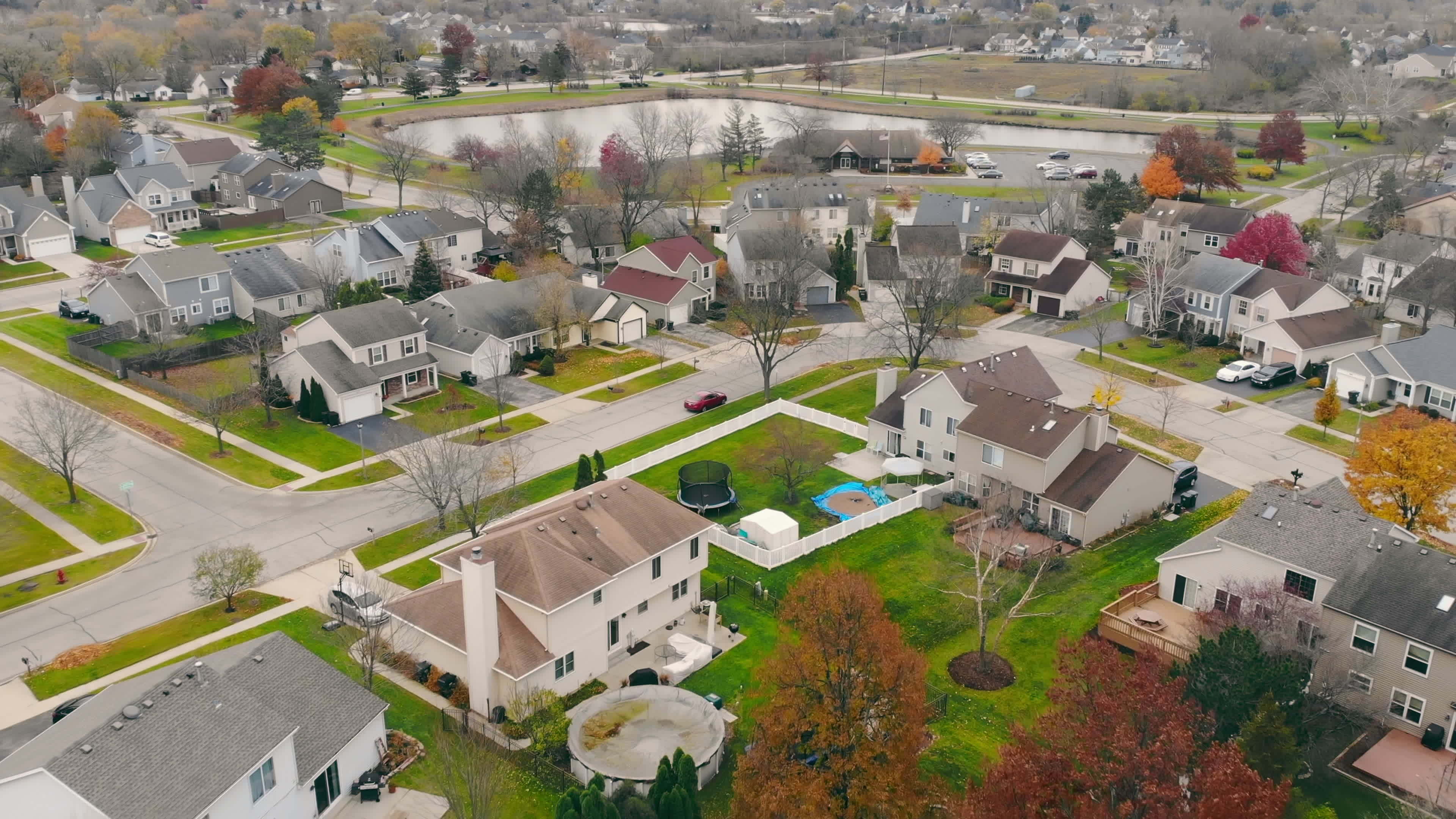 Aerial Drone View of American Suburb at Summertime Establishing Shot