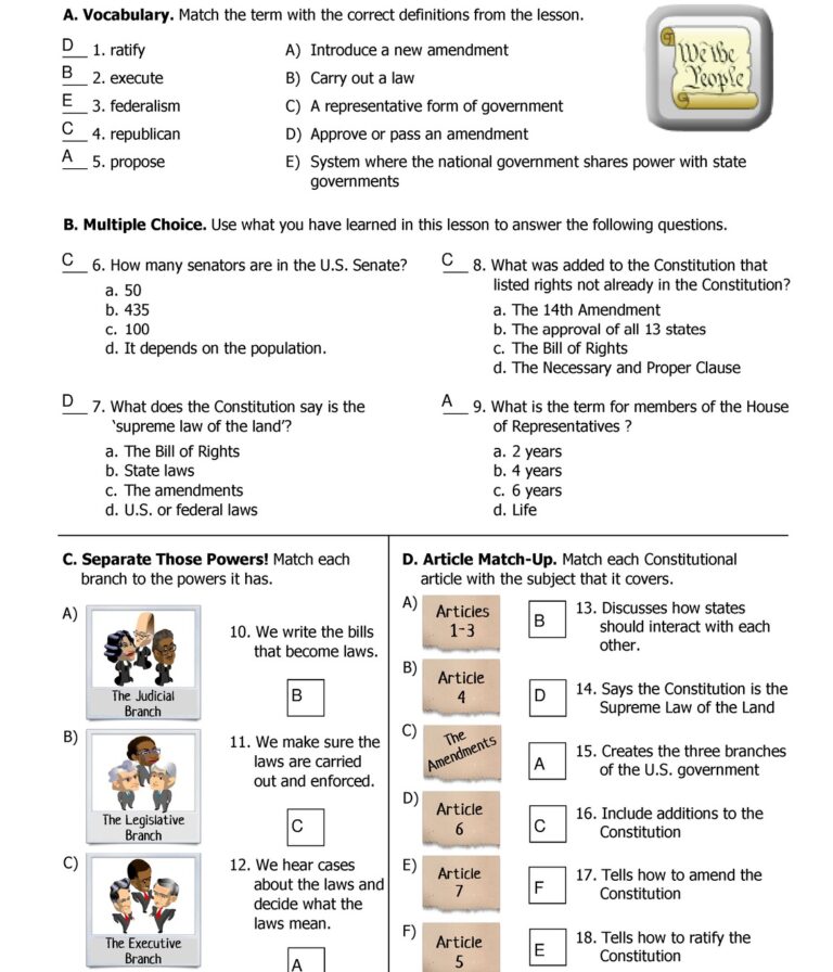 The Constitution Worksheet: Downloadable PDF for Kids Answers and