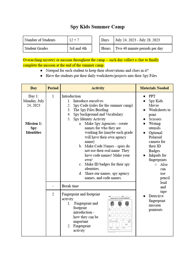 summer camp plan PDF