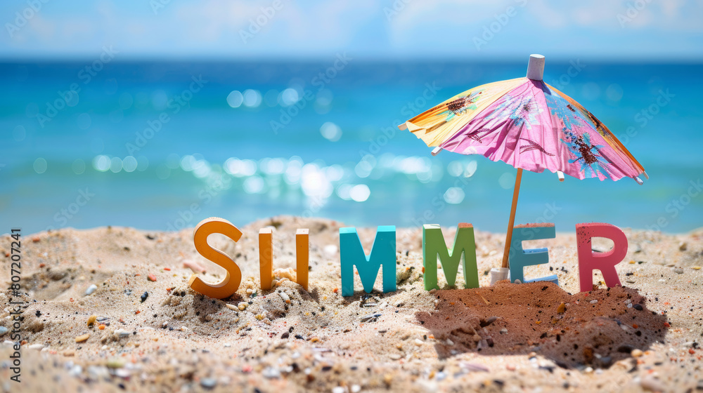 texte quot SUMMER quot écrit avec des lettres en bois colorés sur la plage sous