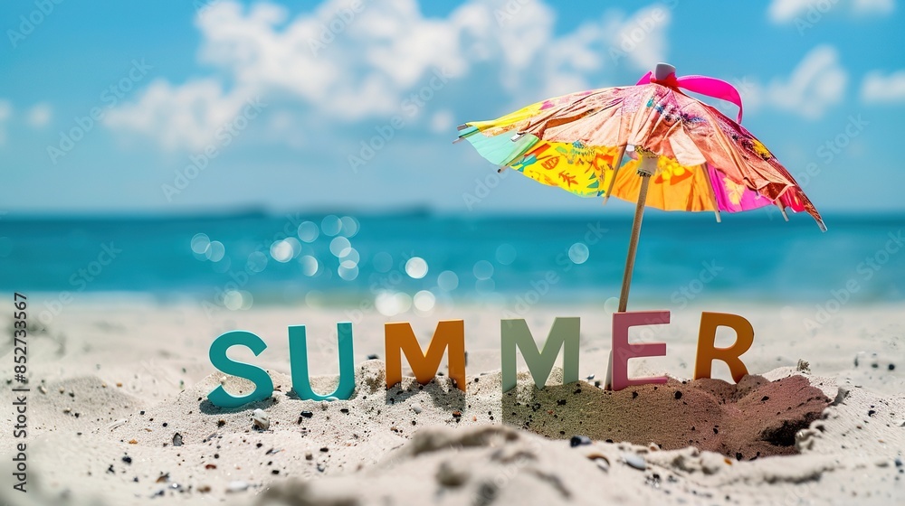 Summer (3D Rendering Text) White Word with Beach Umbrella on San Stock
