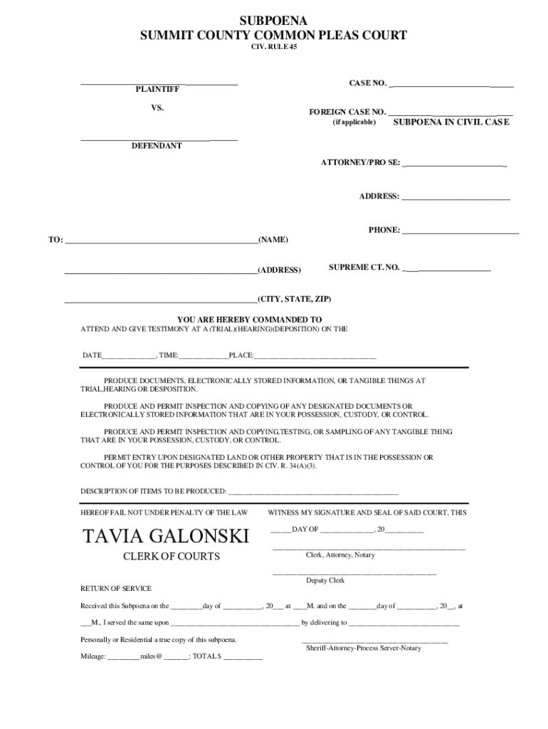 Subpoena Form Summit County Common Pleas Court printable pdf download