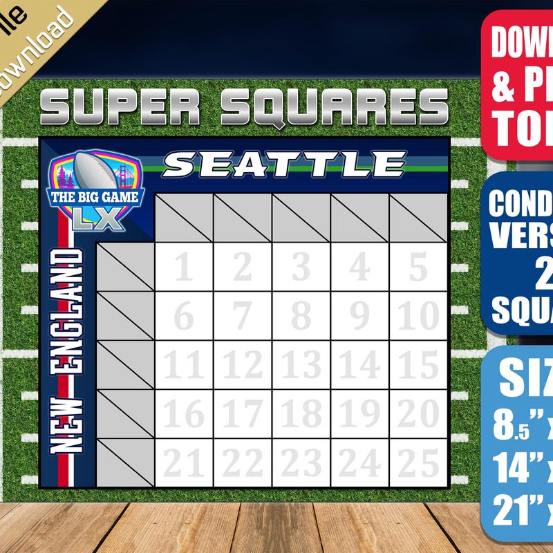 Super Bowl 2026 squares template to print for Seahawks Patriots