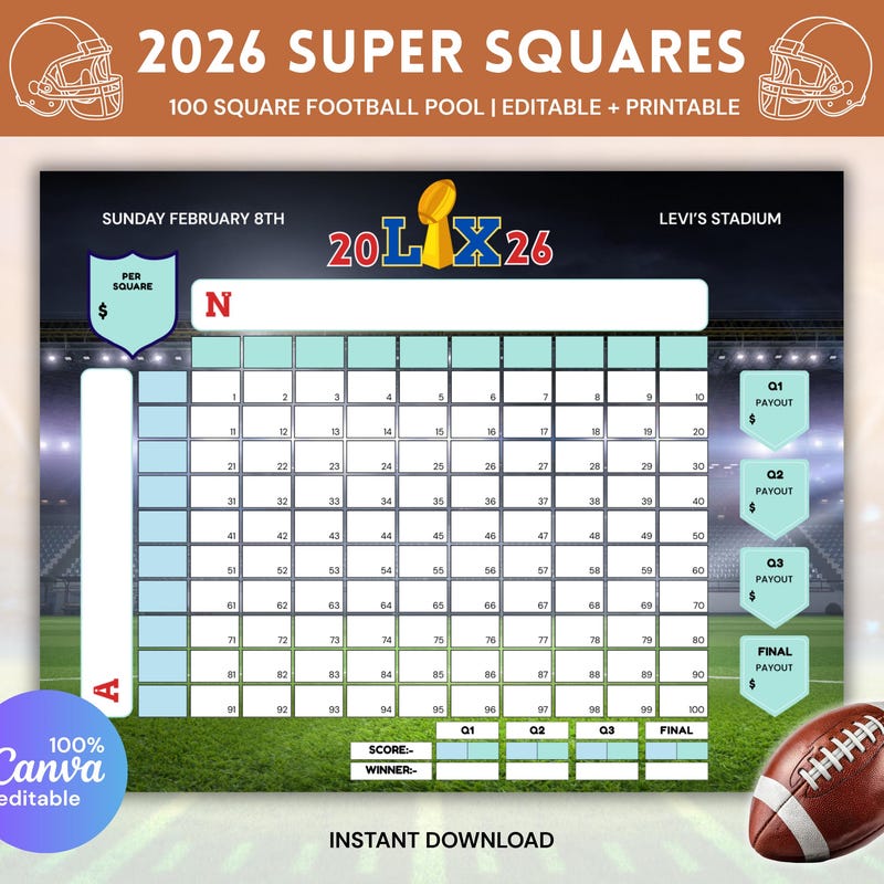 Printable Super Bowl squares Template Editable Free download and