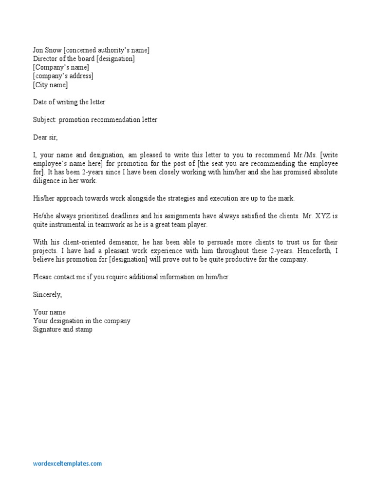 Free Supervisor Recommendation Promotion Letter Template to Edit Online