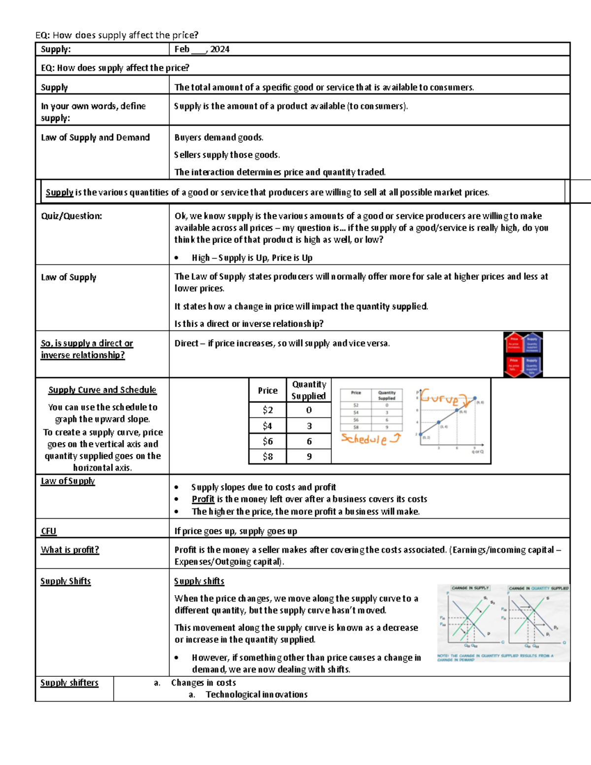 Supply Notes EQ: How does supply affect the price? Supply: Feb