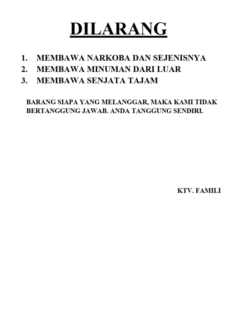 Dilarang: 1 Membawa Narkoba Dan Sejenisnya 2 Membawa Minuman Dari