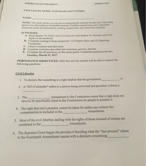 AMERICAN GOVERNMENT SPRING 2017 UNIT 3 STUDY GUIDE Chegg com