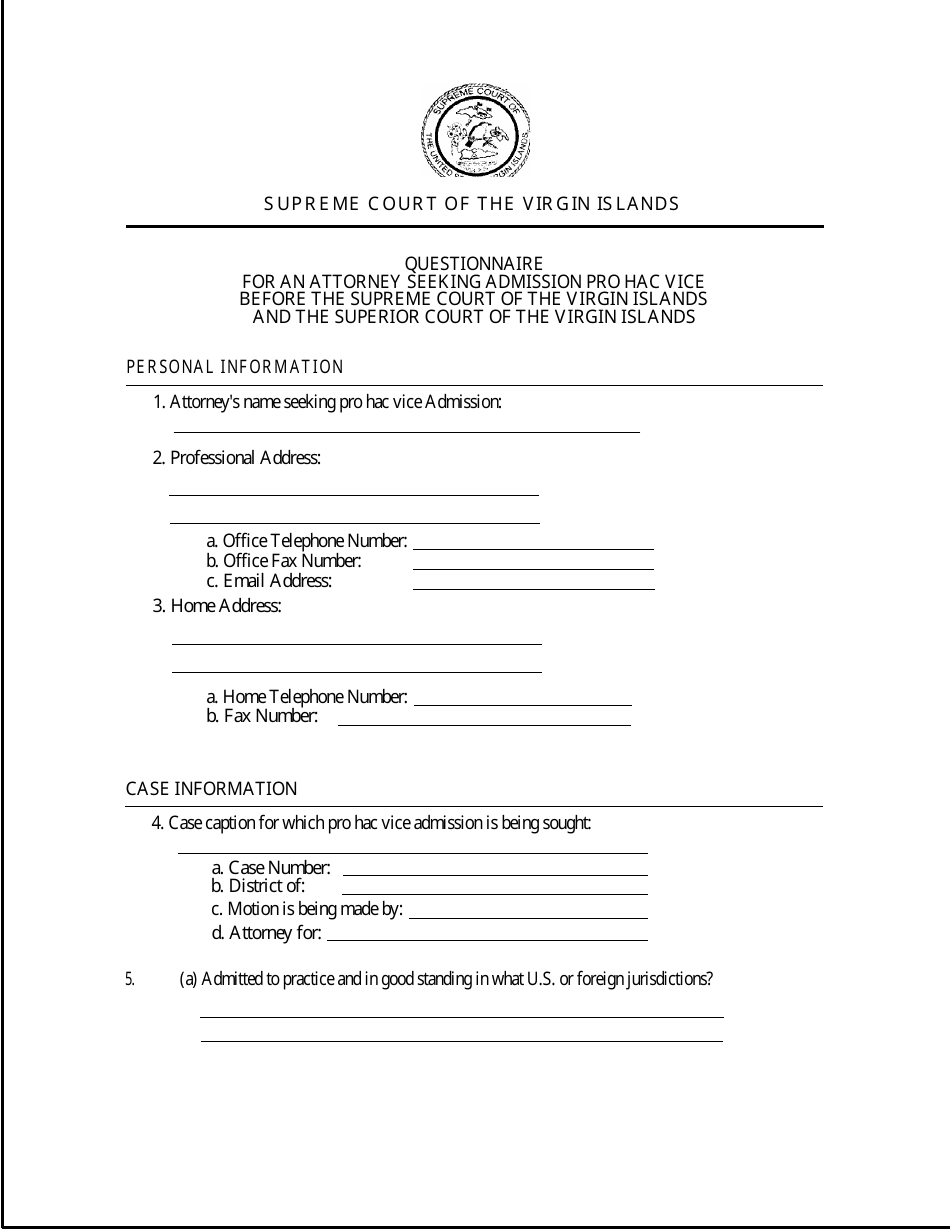 Virgin Islands Questionnaire for an Attorney Seeking Admission Pro Hac
