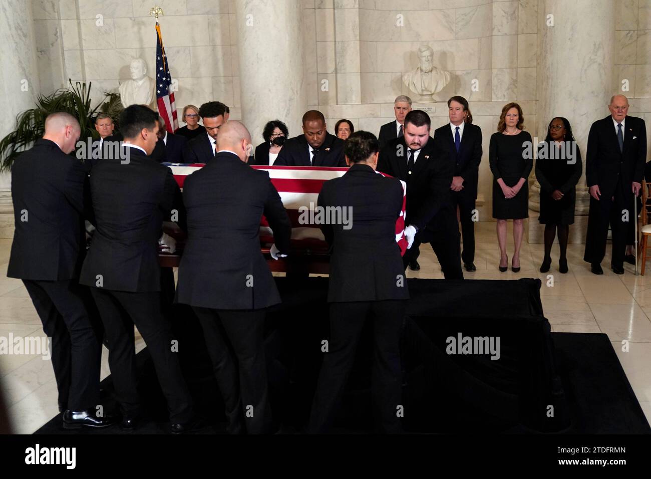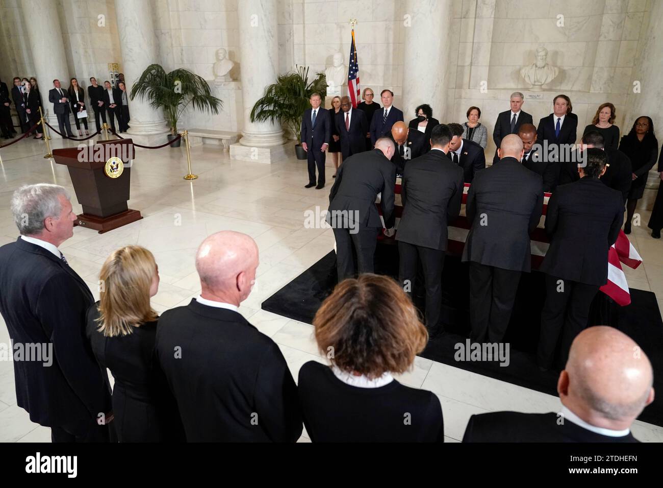 Supreme Court Police officers place the flag draped casket of retired