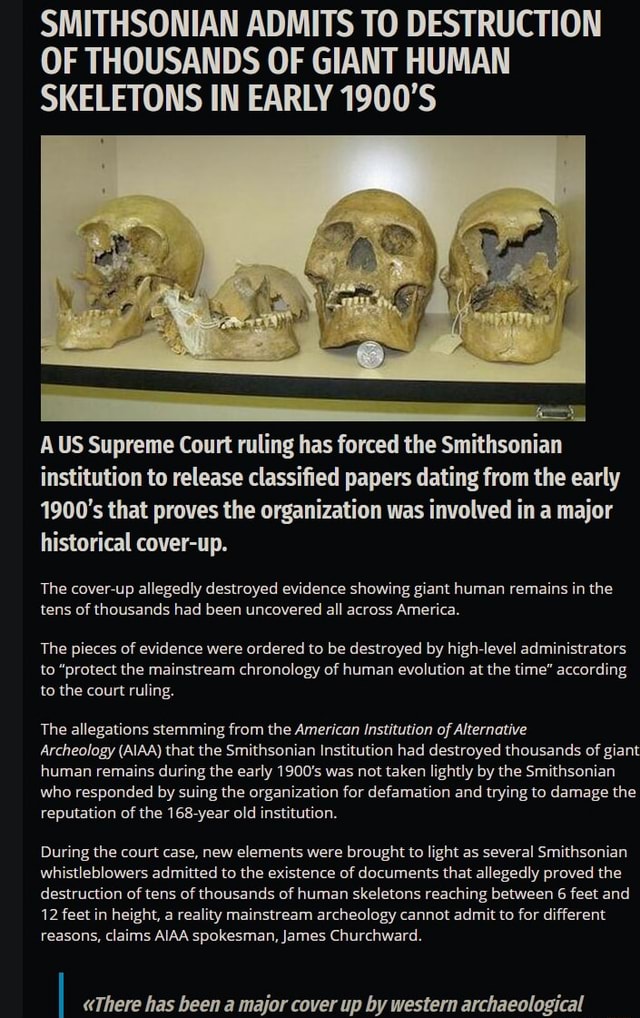 SMITHSONIAN ADMITS TO DESTRUCTION OF THOUSANDS OF GIANT HUMAN SKELETONS