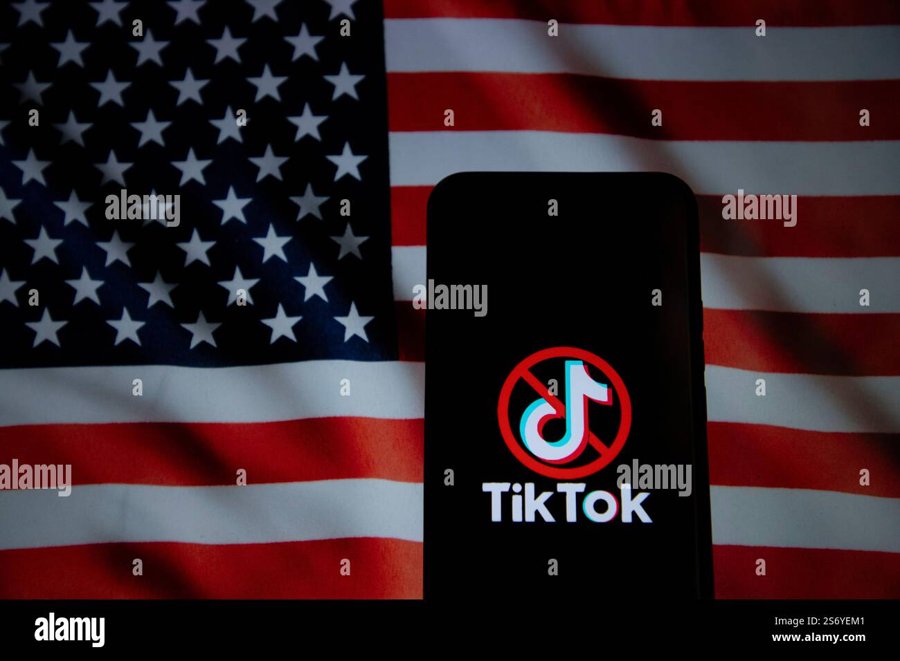 In this photo illustration the banned TikTok logo is seen displayed on