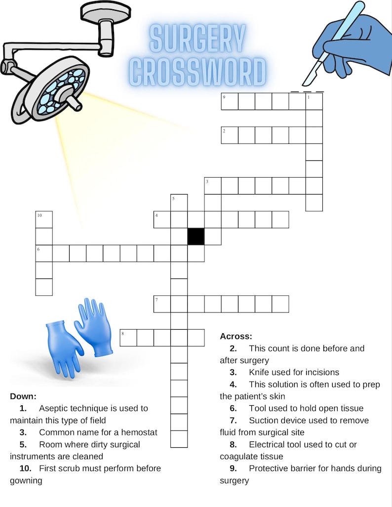 Surgical Themed Crossword Puzzle Printable OR Scrub Tech Game Fun