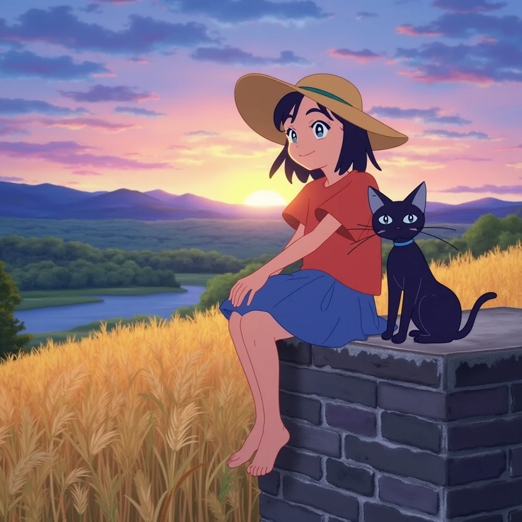 Escape to the tranquil charm of a summer night as the girl perches atop