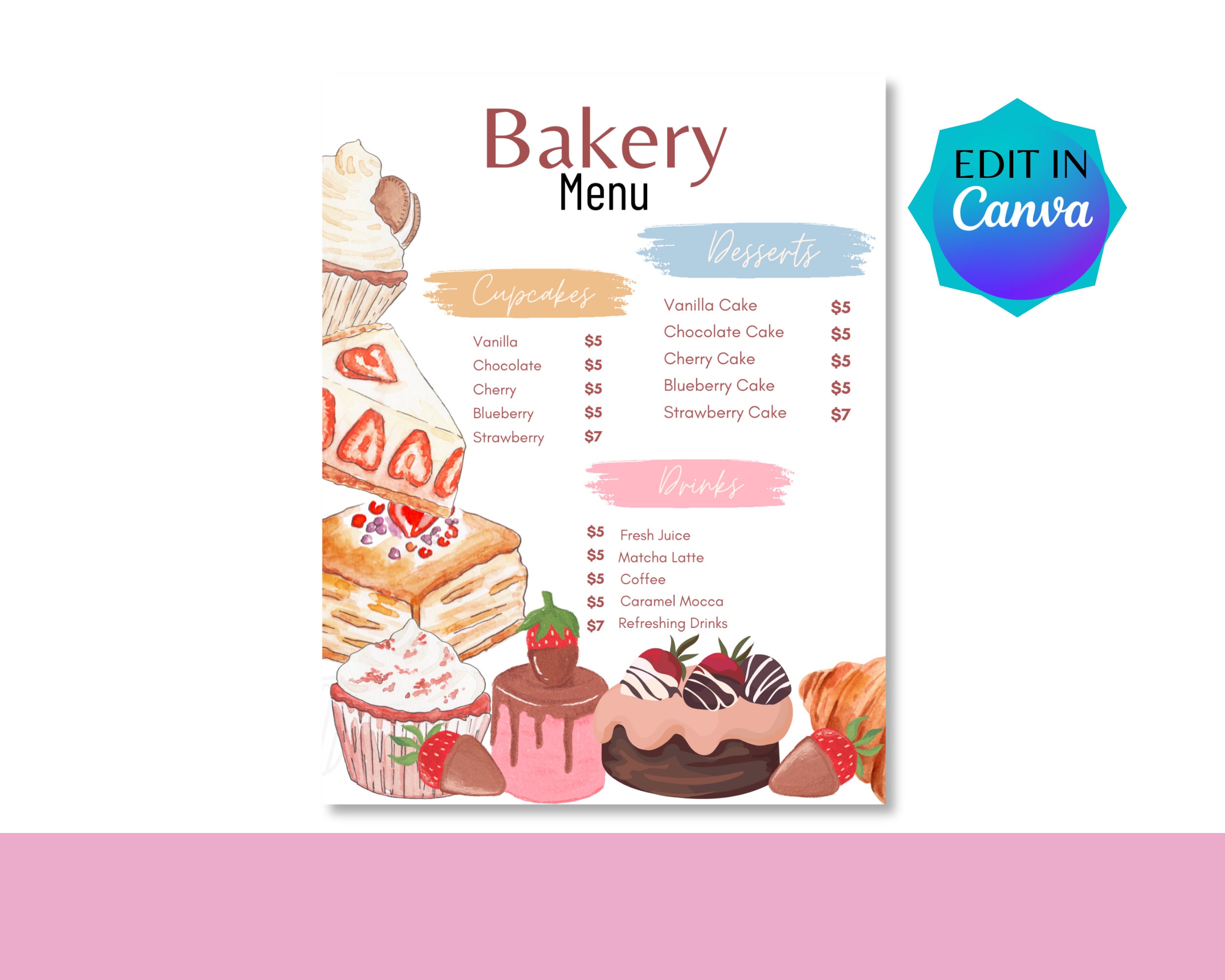 Dessert Menu Template Customizable Cupcake Menu Editable Menu Bakery