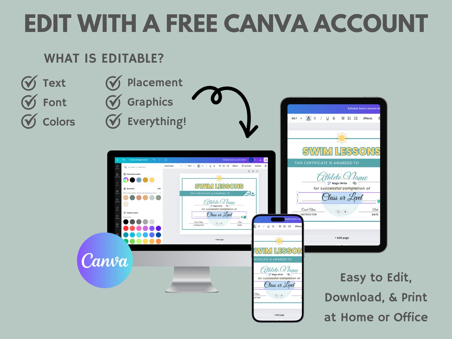 Editable Swim Lesson Certificate Template Canva Template Printable
