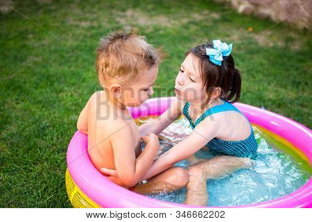 Two Little Brother and Sister Playing and Splashing in Pool on Hot