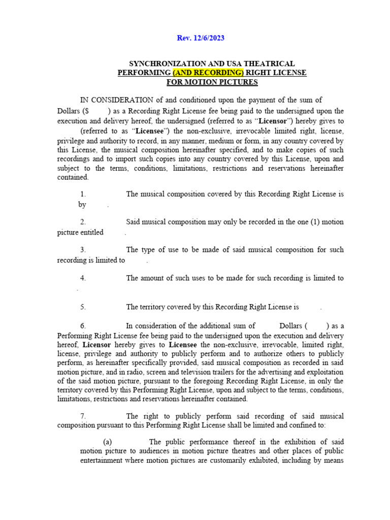 FILM SYNCHRONIZATION LICENSE AGREEMENT OnlineMusicContracts Com