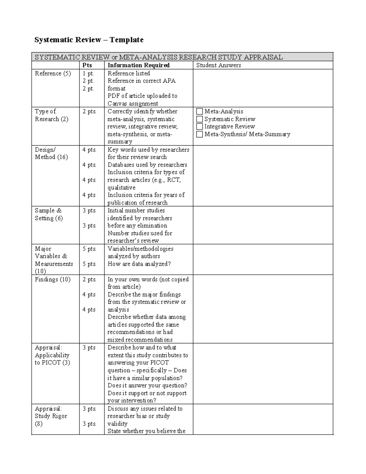 Systematic article appraisal Systematic Review Template