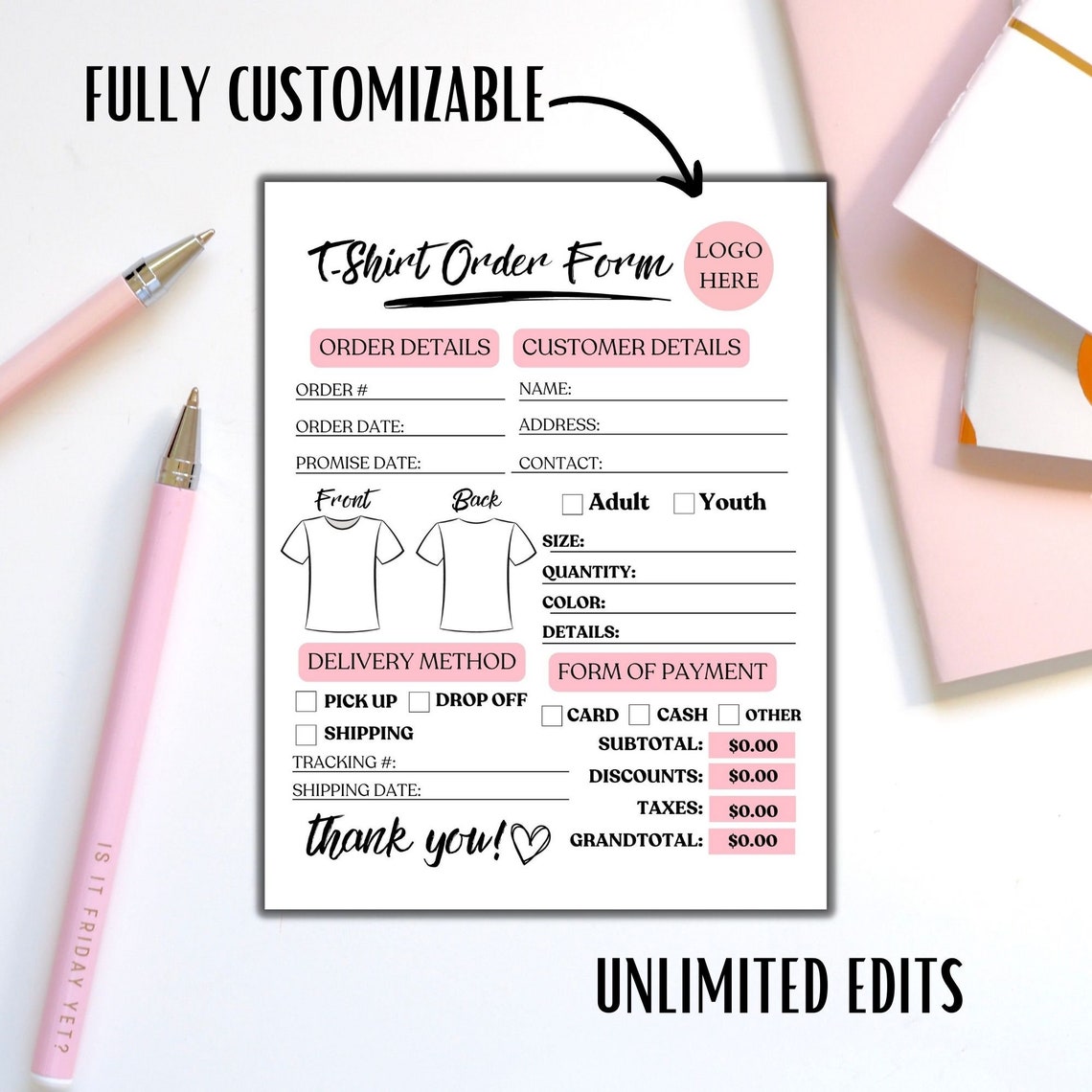 T shirt Order Form Template Customizable Order Form Printable Etsy