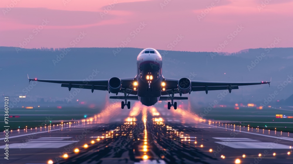 Airplane taking off a runway at twilight Stock Photo Adobe Stock