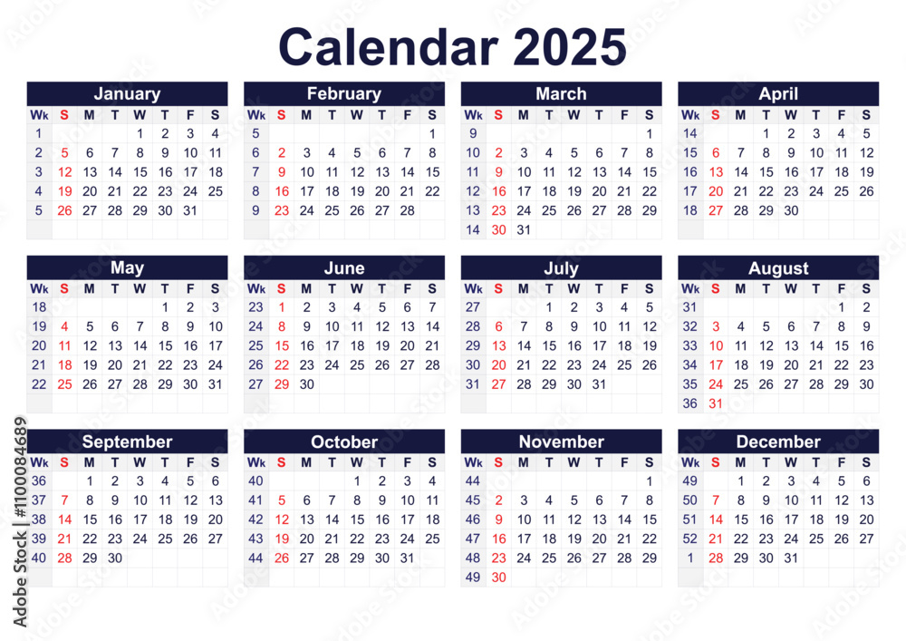 2025 Calendar with Week Numbers Vector Template Stock Vector Adobe Stock