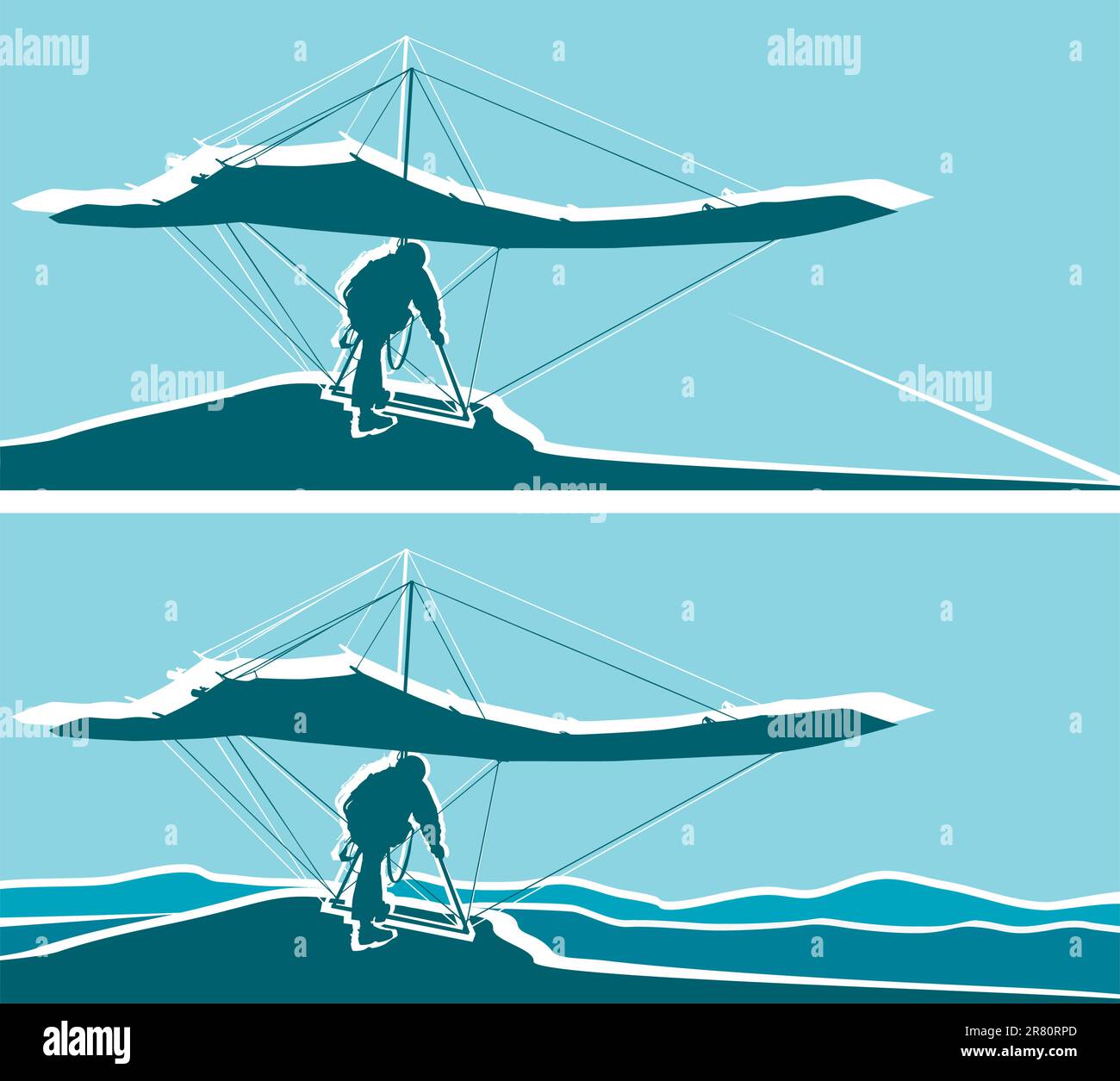 Silhouette of hang glider waiting to take off Mountains and blue sky