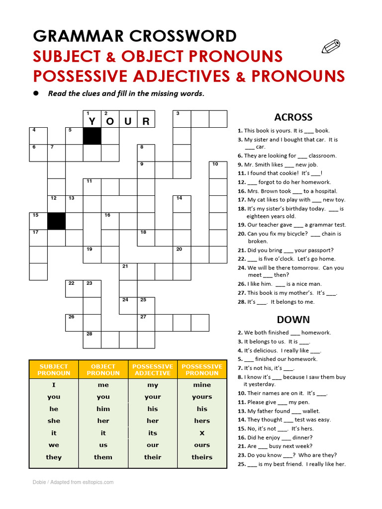Grammar Crossword Possessive Adjectives Pronouns Subject Object