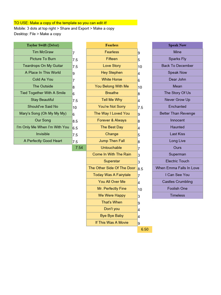 Taylor Swift Song Album Ranking Spreadsheet (google Sheets Instant
