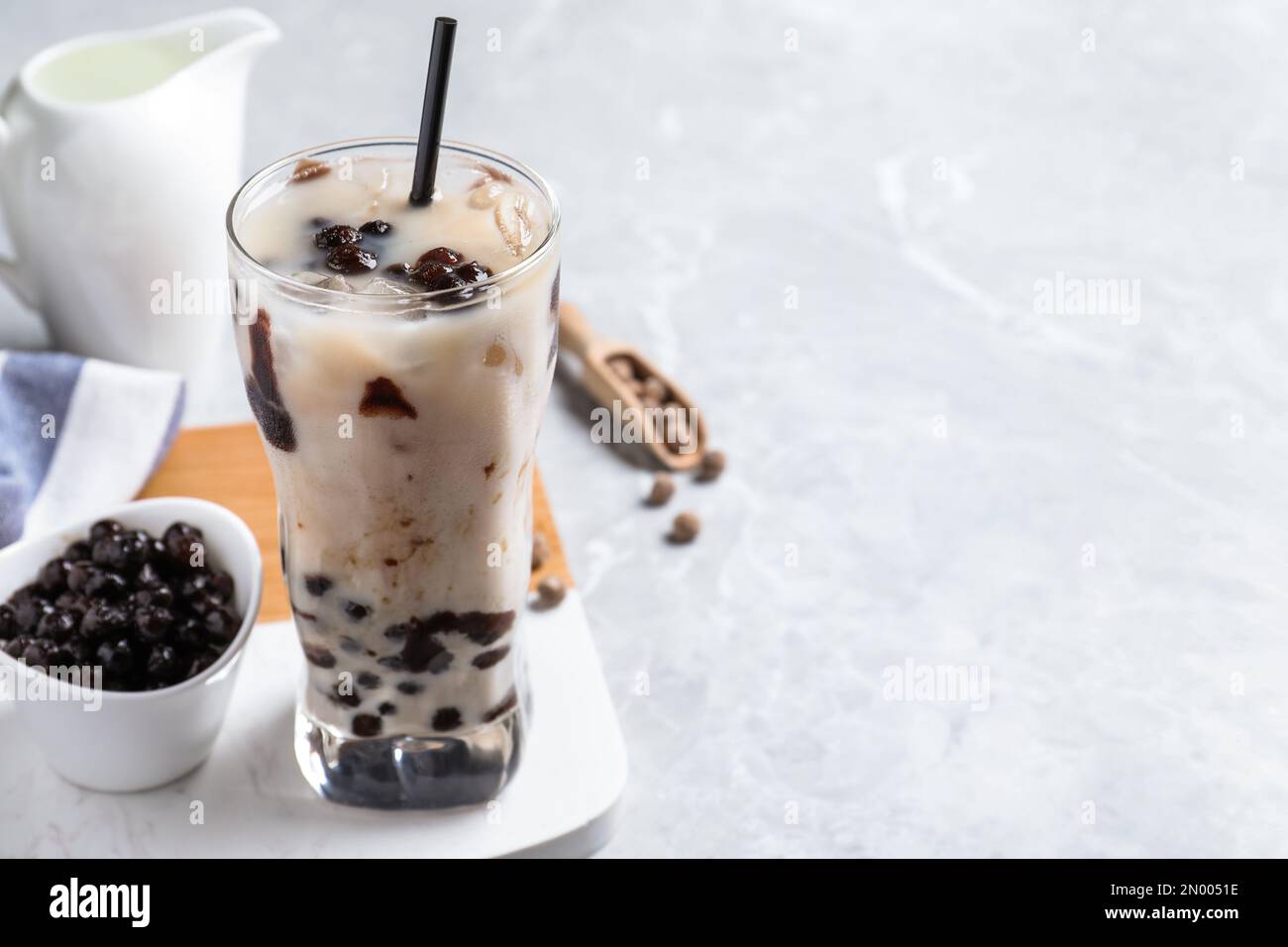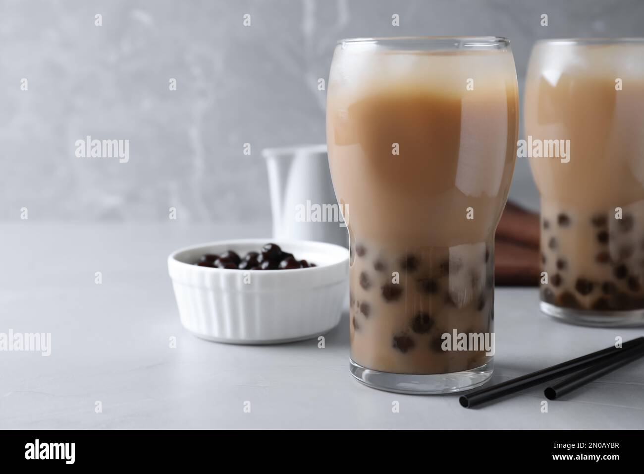 Bubble milk tea with tapioca balls on light table Space for text Stock