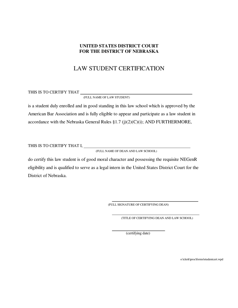 Nebraska Law Student Certification Fill Out Sign Online and Download