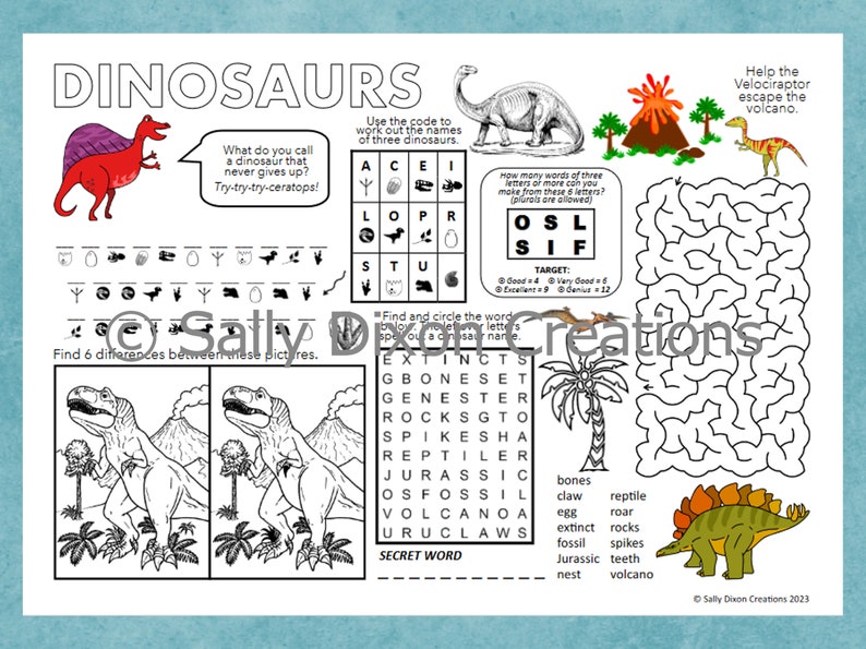DINOSAURS Printable Puzzle Place Mat Crossword Puzzles Dinosaur