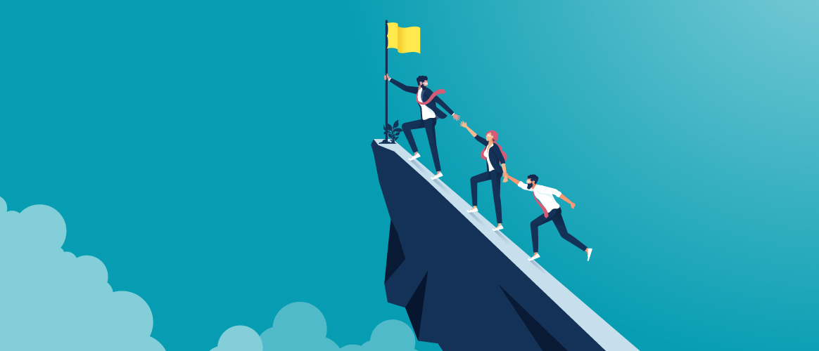 Leader helps the team to climb the cliff and reach the goal 3407558