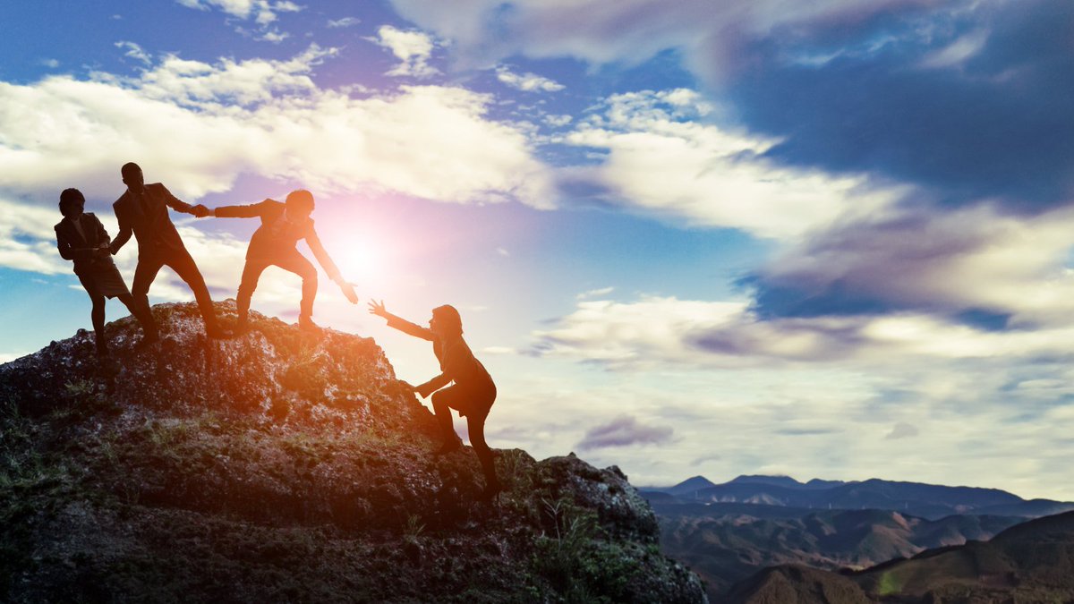 Silhouette of people helping each other hike up a mountain at sunrise