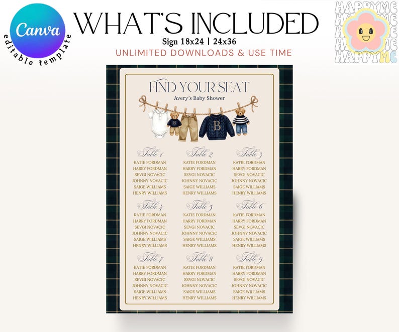 Editable Luxury Teddy Bear Baby Shower Seating Chart Classic Plaid