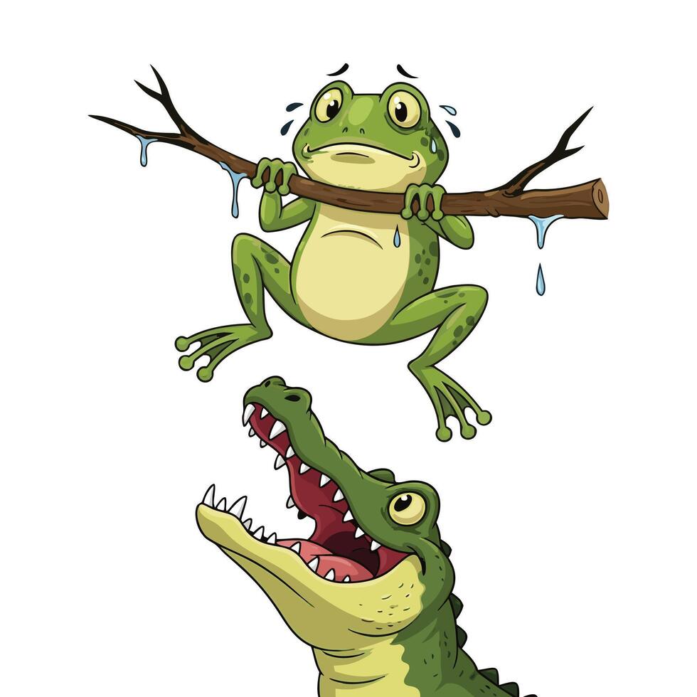 Cartoon Illustration of a frog clinging to a branch escaping a hungry