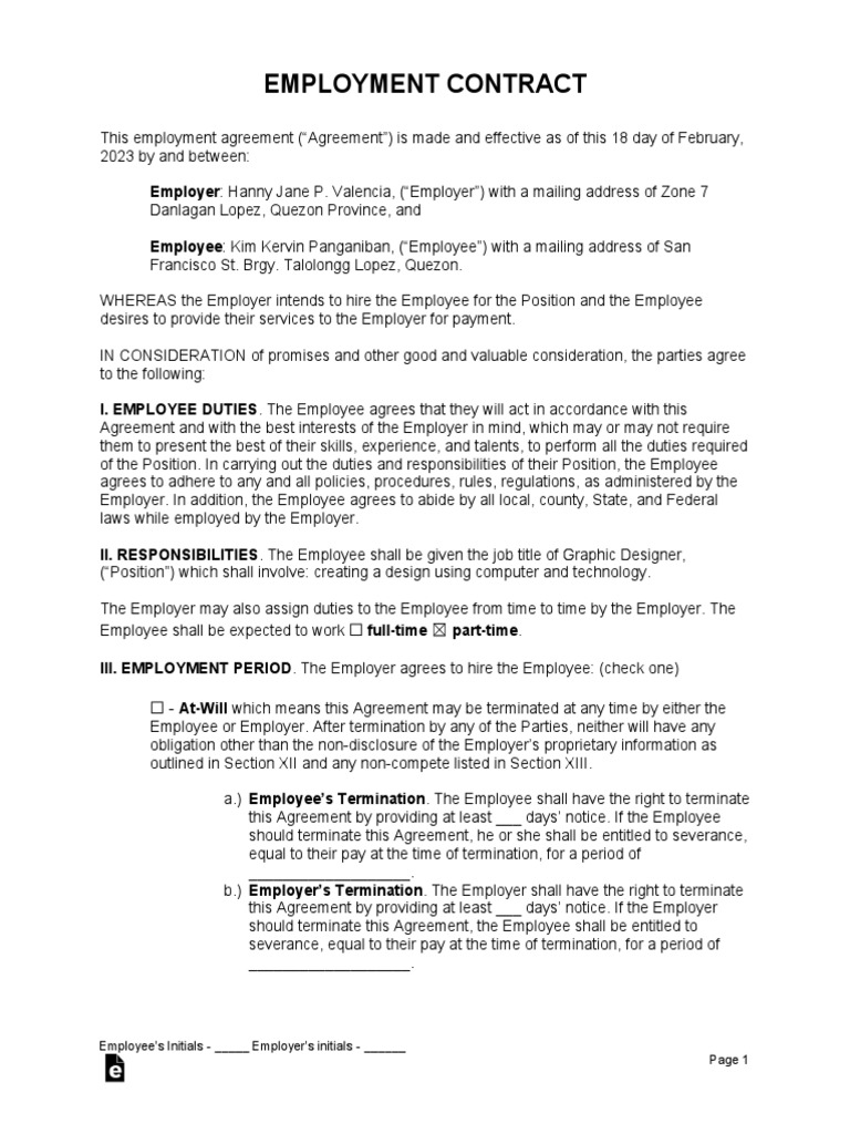 Free Printable Employment Contract Form Templates Letter PDF Word