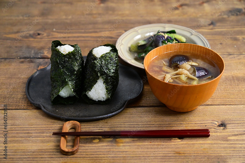 おにぎりと副菜、みそ汁 Stock Photo Adobe Stock