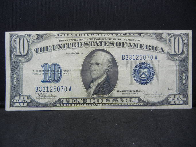 1934 C Ten Dollar * BLUE SEAL SILVER CERTIFICATE * GENERAL CIRCULATED