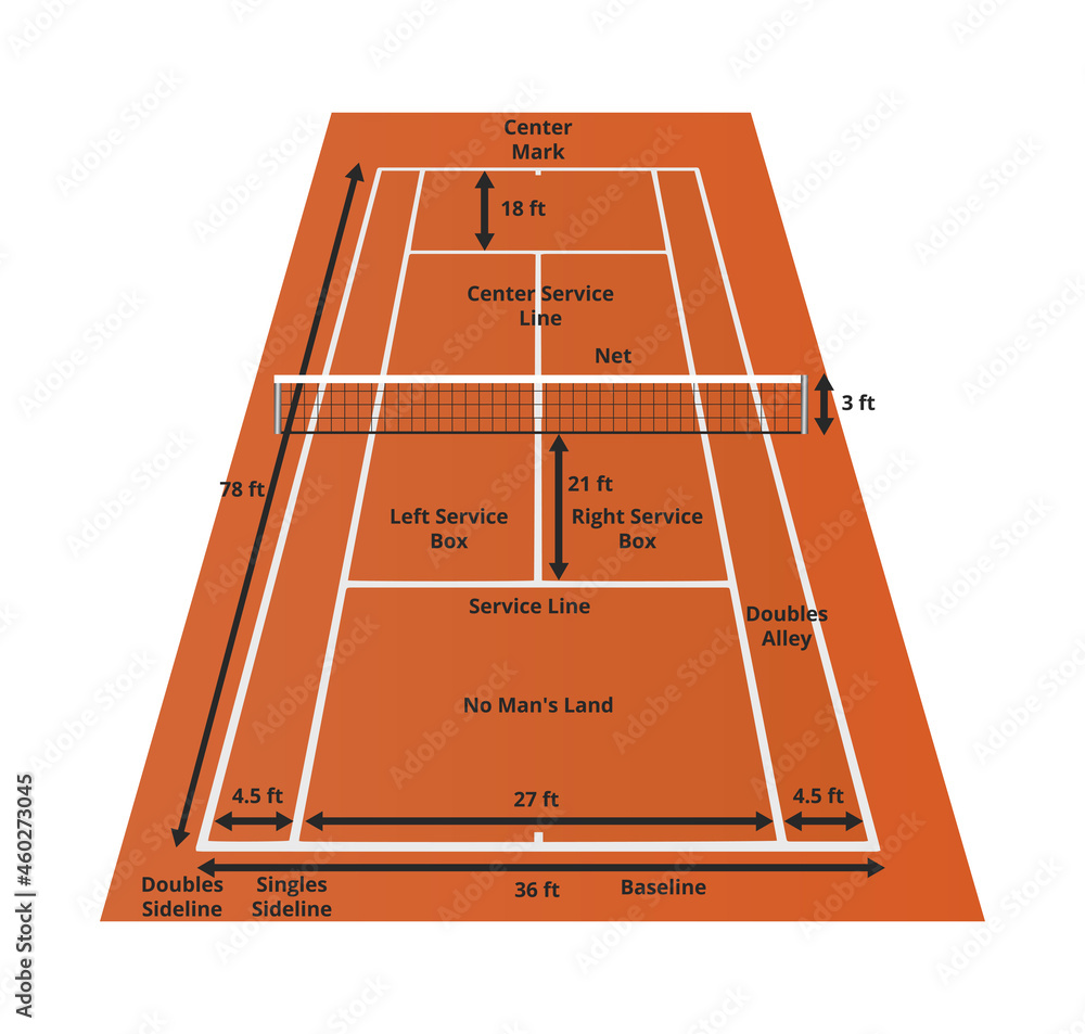 Vector illustration of tennis clay court with dimensions in feet ft