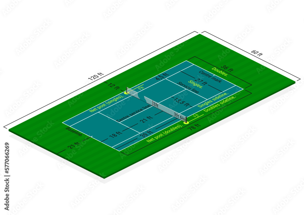 Tennis court dimensions diagram in feet Isometric view of standard