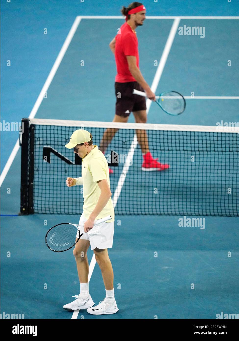 Jannik Sinner of Italy left and Alexander Zverev of Germany walk on