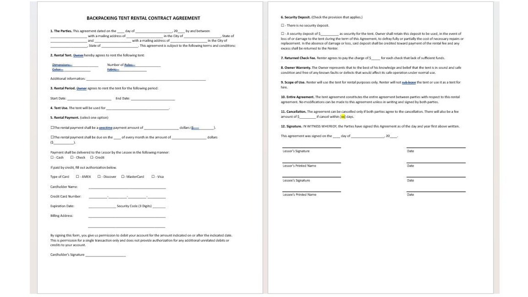 Editable Backpacking Tent Rental Contract Agreement Tent Rental