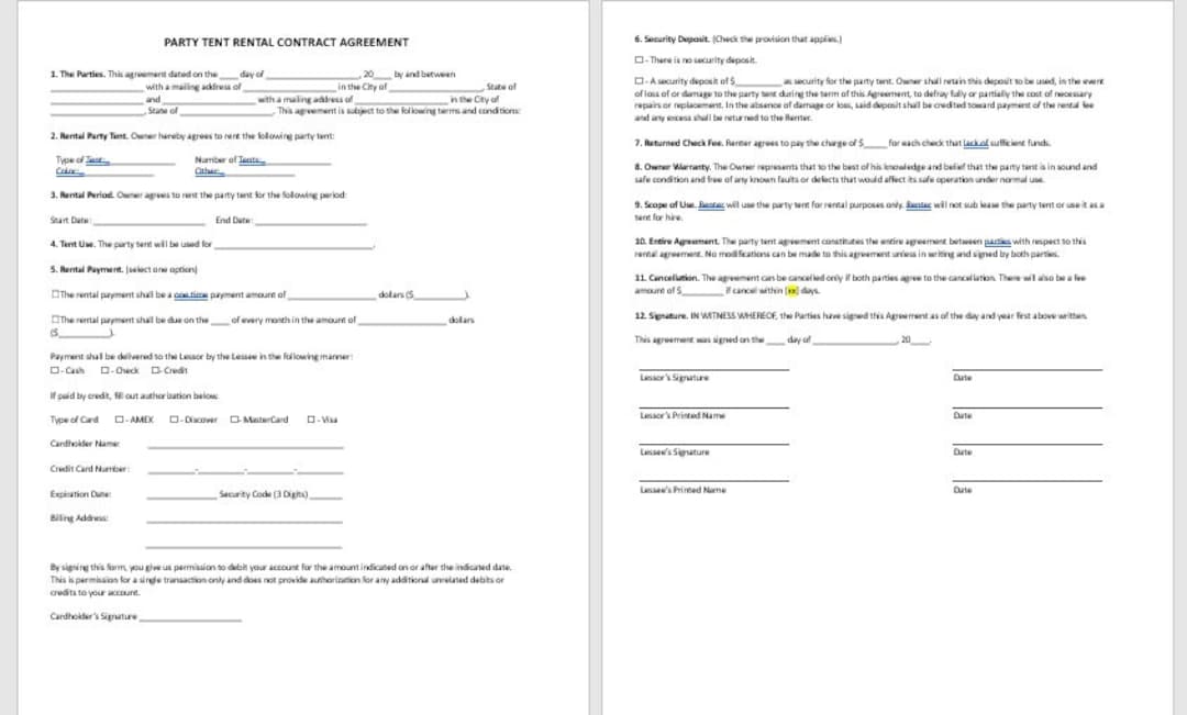 Editable Tent Rental Agreement Party Equipment Rental Contract