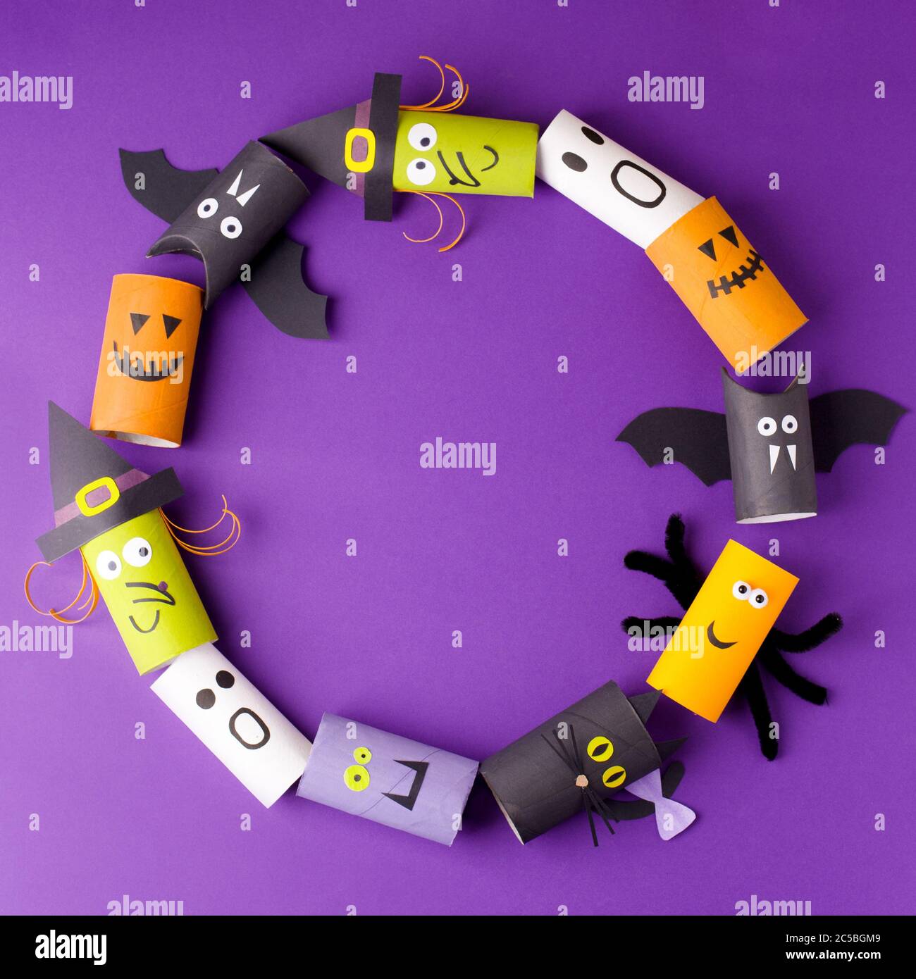 Wreath of Monsters from toilet tube on purple for halloween decor A