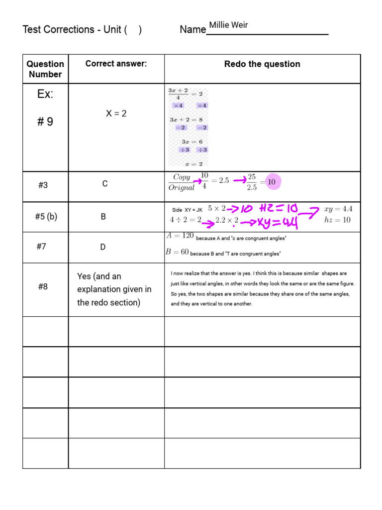 Math Test Correction Template by Grades 7 9 Math and more TPT