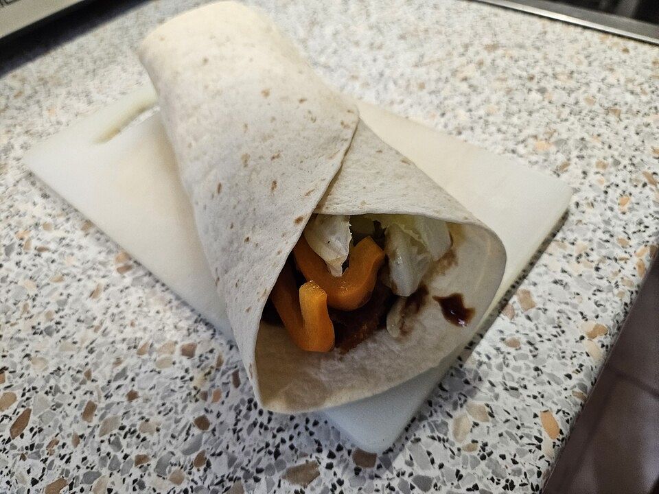 Lunch Special: Tex Mex wrap Chipotle BBQ pulled pork onion rings