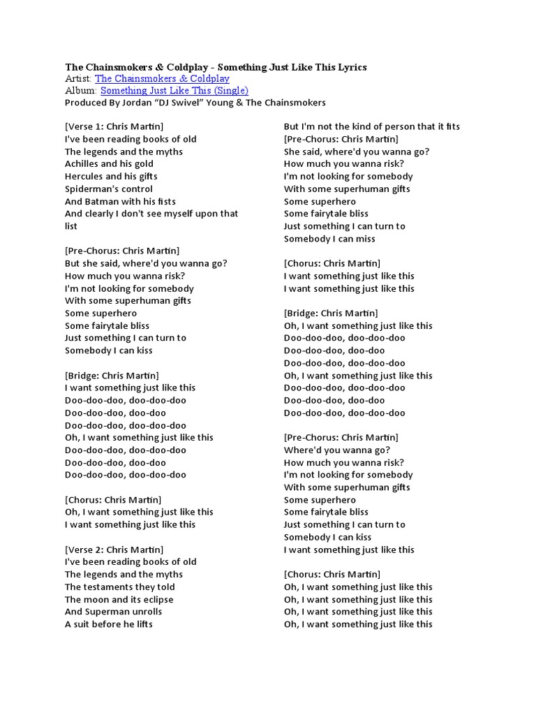The Chainsmokers Coldplay Something Just Like This Lyrics PDF