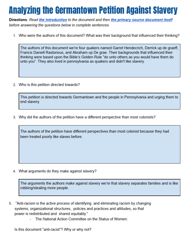 The 1688 Germantown Quaker Petition Against Slavery Worksheet Answers